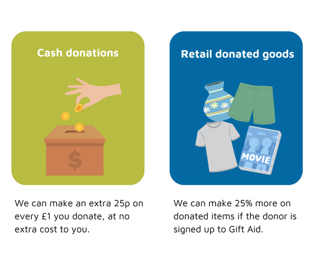 Gift Aid is a process that we use to claim a refund of the tax already paid by the donor. This 25% extra revenue can be claimed from the government when a person donates cash, or items to charity, and agrees to Gift Aid. It is at no extra cost to the donor or the charity, it's just a refund on tax they have already paid and is paid directly to us.
