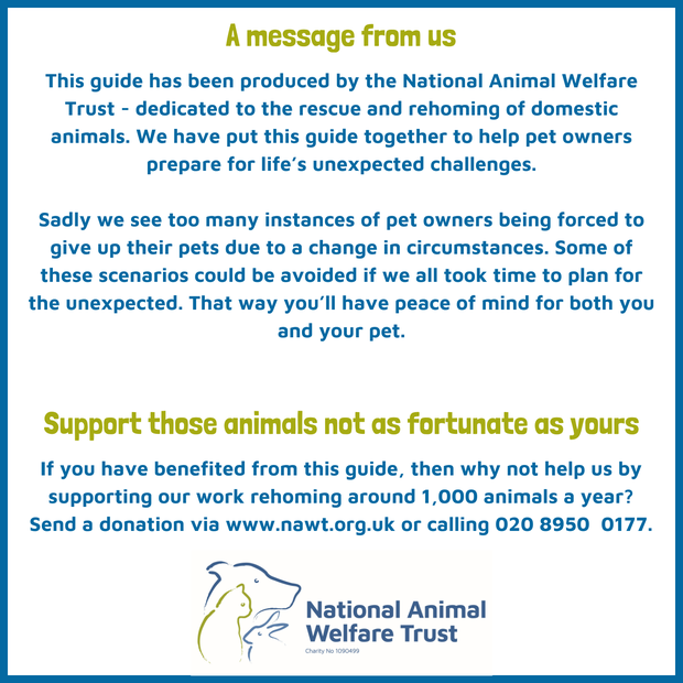 At the National Animal Welfare Trust (NAWT) we know that the unexpected happens to pet owners daily and, like all other rescue centres, we don’t have the space to help everyone. Therefore, we have produced this guide to help you put together an easy-care plan for your pet. Whether it is for the short, medium, or long term to give you the peace of mind that if the unexpected happens, your pet will be safe and well cared for until you return home.