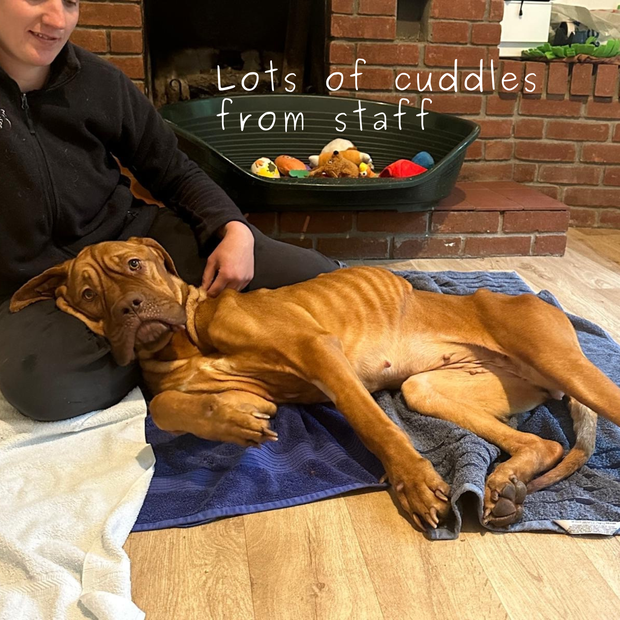 Usually a mild-mannered yet enormous and powerful force of nature, we’d expect a dog of Roxy’s breed to weigh a minimum of 45kg. However, Roxy arrived looking painfully thin with low muscle mass, and barely reached 30kg.