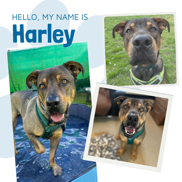 A friendly, but perhaps overenthusiastic, bundle of love, Harley adores people and his fellow dogs. A bit like an overgrown puppy who is desperate to show you all the love he can, Harley sometimes forgets how big he is and needs a few gentle reminders on how to greet his friends nicely.