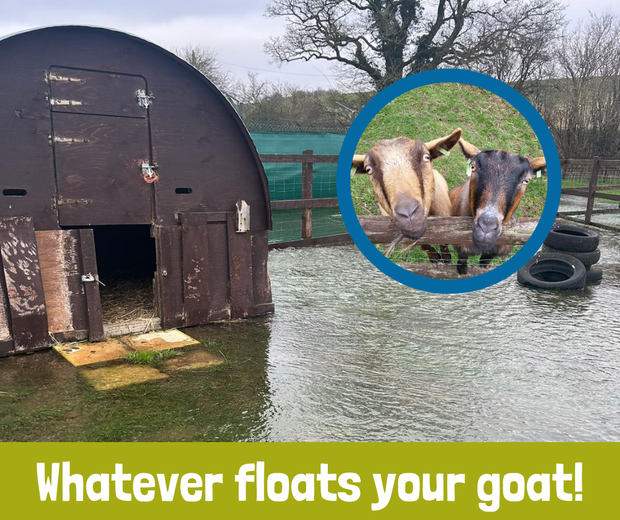 Although many may think the water is a picturesque addition to the farm, the flowing river has made its way across four of our fields. This has caused a lot of stress and confusion to our animals, especially for two of our goats Woody and George.