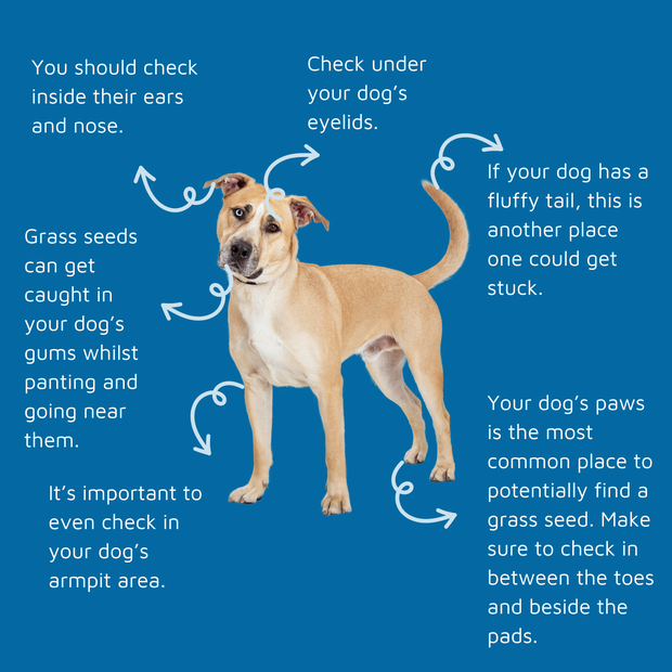 As soon as you get home from a walk, it’s important to check for grass seeds to see if any have become attached to your dog’s fur, or even your clothing. You wouldn’t want to bring any into your home and then risk them re-attaching to your pet. Here are the areas you should ideally focus on when checking your pet over.