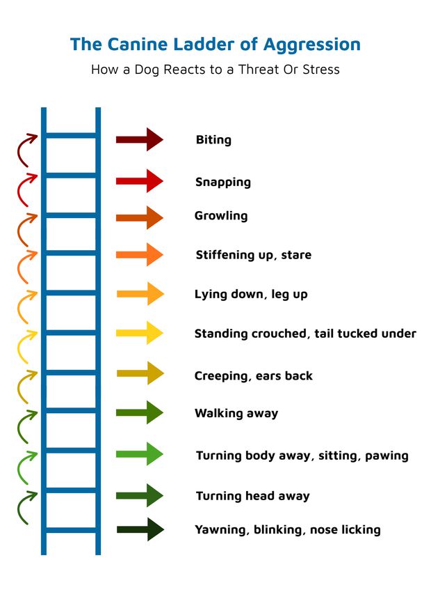 When a dog feels threatened or stressed, they move through a series of escalating behaviours, known as the Canine Ladder of Aggression.
